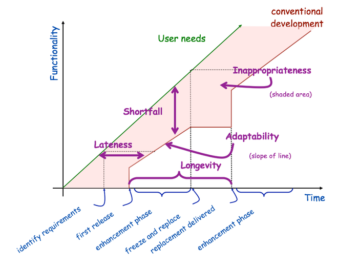 Two, I think you can use this to show how the rate of growth in the gap between needs and system (what Davis calls “inappropriateness”, the shaded area) is also an issue. I think this captures the technical debt problem more succinctly. You will see a growth if, for example, you chose a technology solution that constrains your use of web browser (eg. ActiveX controls mandating IE8). That forces your red line (development/specification/software) to grow slower. Now the question becomes, at what point do you refactor/reengineer so that the rate of adaptability (the slope) increases again?